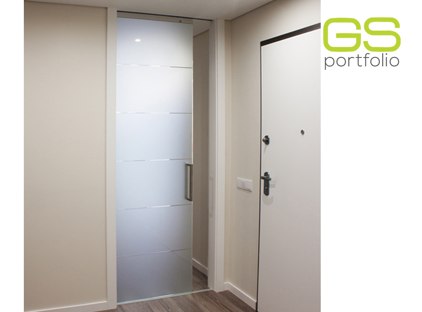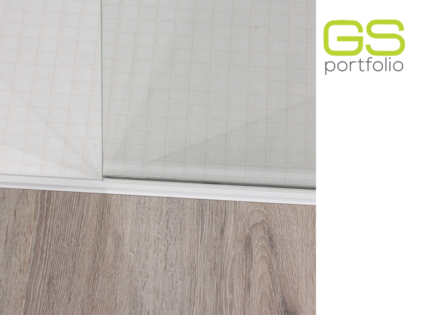 - Système de porte coulissante INSIDE by OPENSPACE avec porte laquée blanc mat avec coins. Conjugué avec un panneau en verre mat blanc fixe avec coins.