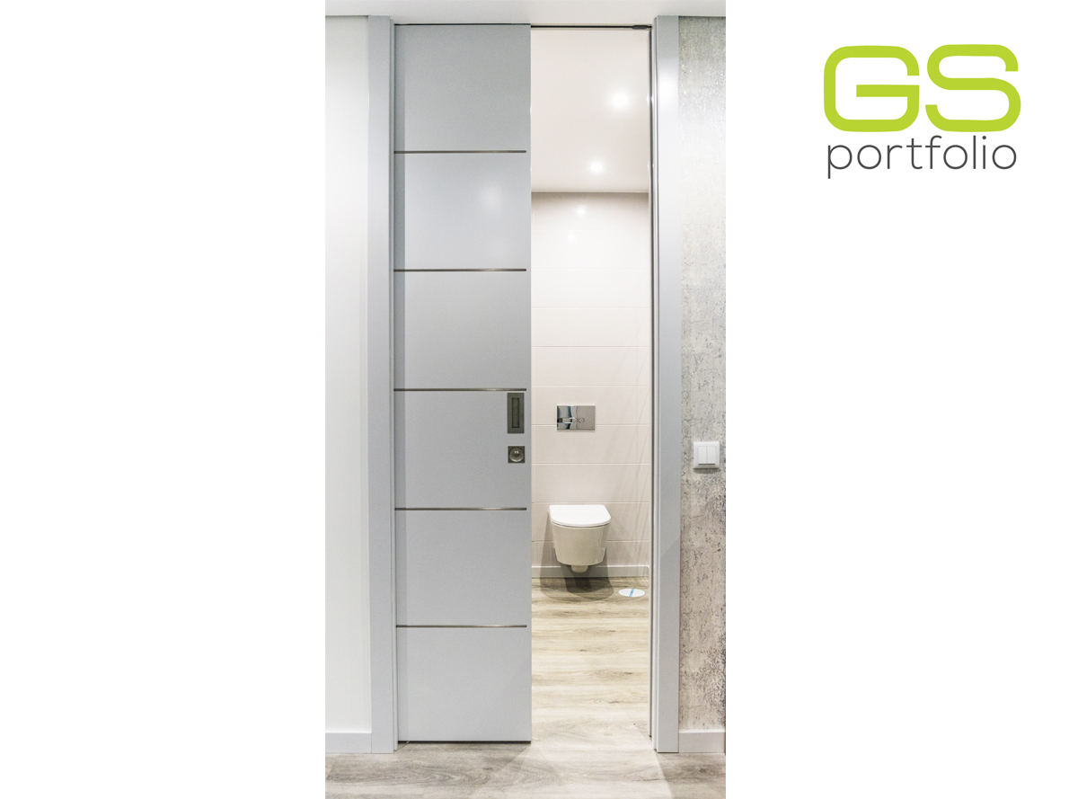- Porte battante GS DOORS, modèle PLUS (jusqu'au plafond), en laqué blanc mat avec coins. Serrure magnétique.