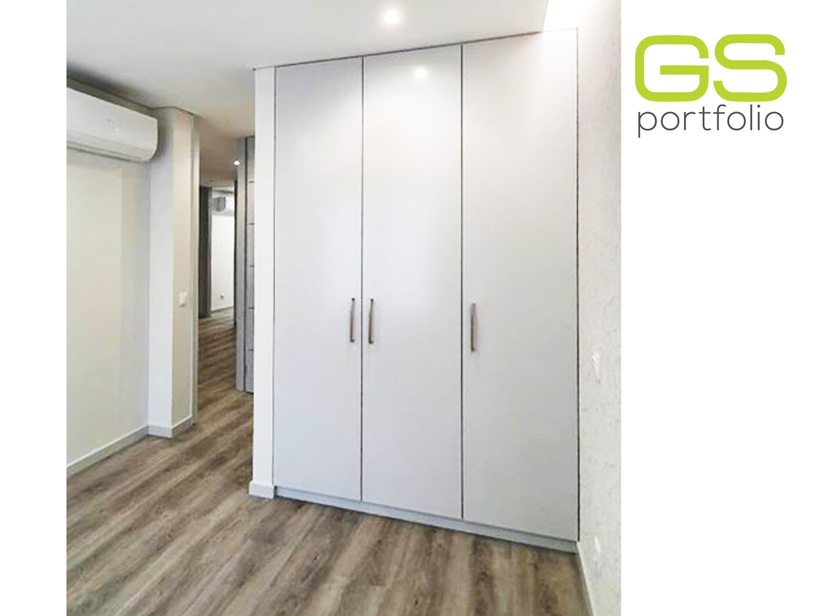 - Armoire encastrée avec portes battantes laquées blanc mat par GS CONCEPT. Tiroirs avec glissières cachées et système de fermeture en douceur.