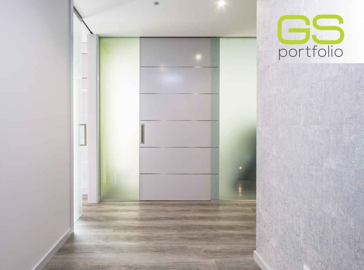 - Système de porte coulissante INSIDE by OPENSPACE avec porte laquée blanc mat avec coins. Conjugué avec un panneau en verre mat blanc fixe avec coins.