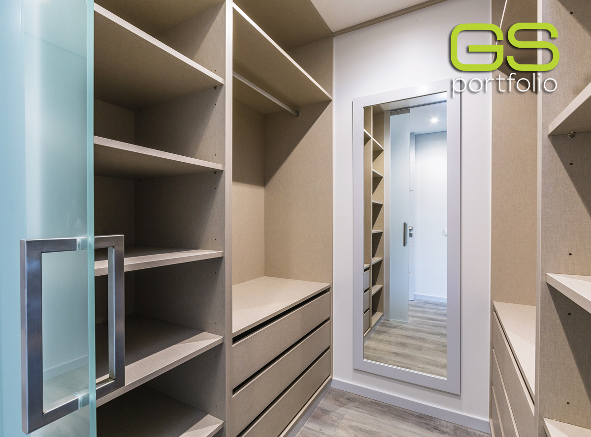 - Placard avec séparateurs, étagère à chaussures et tiroirs avec glissières cachées et système de fermeture amortie par GS CONCEPT. Compartiment fermé avec une porte coulissante en verre dépoli blanc.