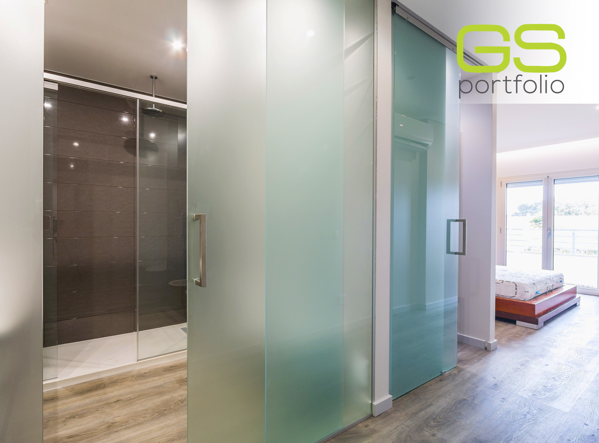 - Système de porte coulissante INSIDE DV by OPENSPACE avec panneau fixe en verre dépoli, associé à une porte coulissante en verre dépoli !