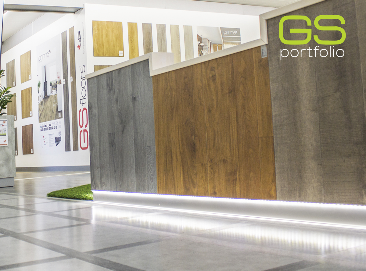 Zócalo empotrado en aluminio GS FLOORS 70 x 14 mm con aplicación de cinta LED. (Aplicación show room GOSIMAT)