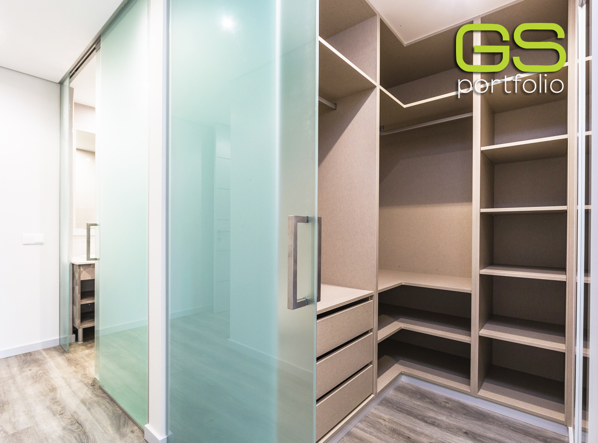 - Placard avec séparateurs, étagère à chaussures et tiroirs avec glissières cachées et système de fermeture amortie par GS CONCEPT. Compartiment fermé avec une porte coulissante en verre dépoli blanc.