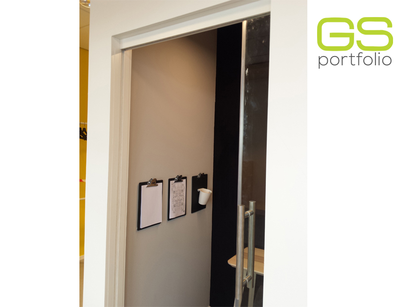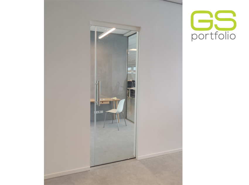 Contre-châssi UNICO avec porte en verre translucide et bandeau supérieur en aluminium. By OPENSPACE!